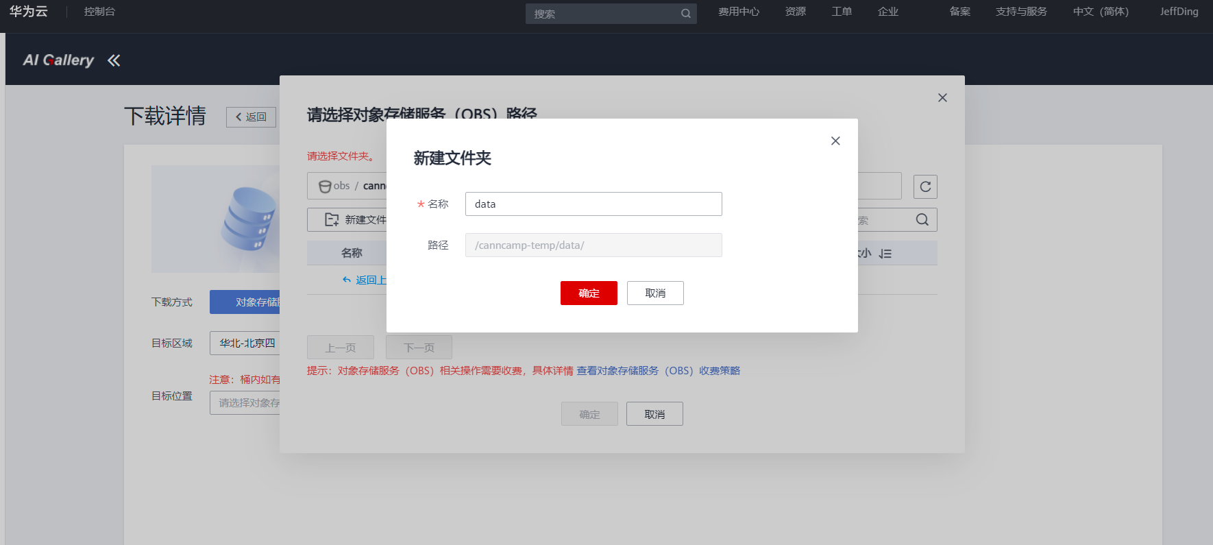 在出来的页面中【目标位置】这一栏点击右面的文件夹小图标,选择我们前面第一步创建的OBS,然后在出来的页面中点击【新建文件夹】创建一个文件夹data(为了方便管理),然后点确定。随后返回到页面后继续点确定,就开始将数据集下载到OBS中了。
