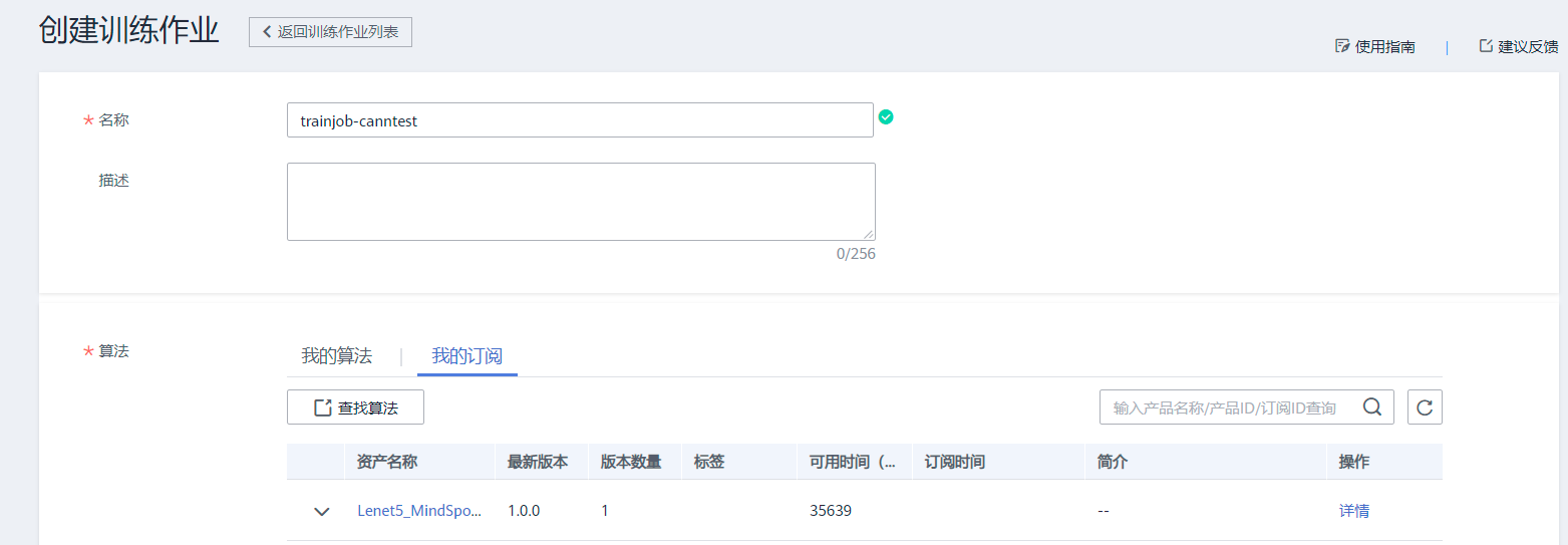 训练作业名字自定义即可,【算法】选择【我的订阅】,然后找到前面订阅的算法【Lenet5_Mindspore】,然后点向下的小箭头,然后在1.0版本前选中