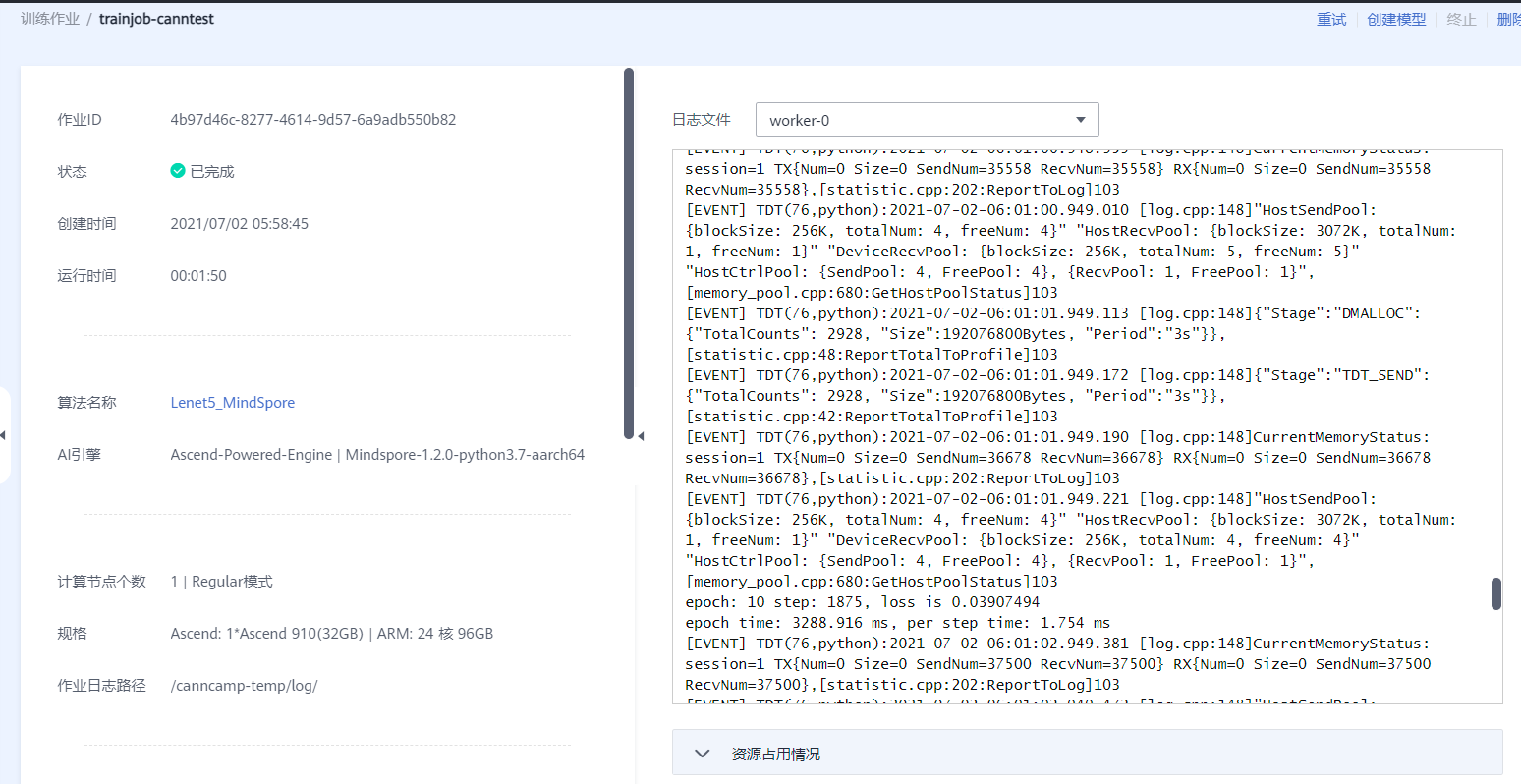 当在页面中看到状态为【已完成】,然后就可以去右面的日志文件显示的地方看下有没有epoch 相关的信息。因为训练的时候还有Event日志信息打印出来,所以要稍微找一下,应该不难。