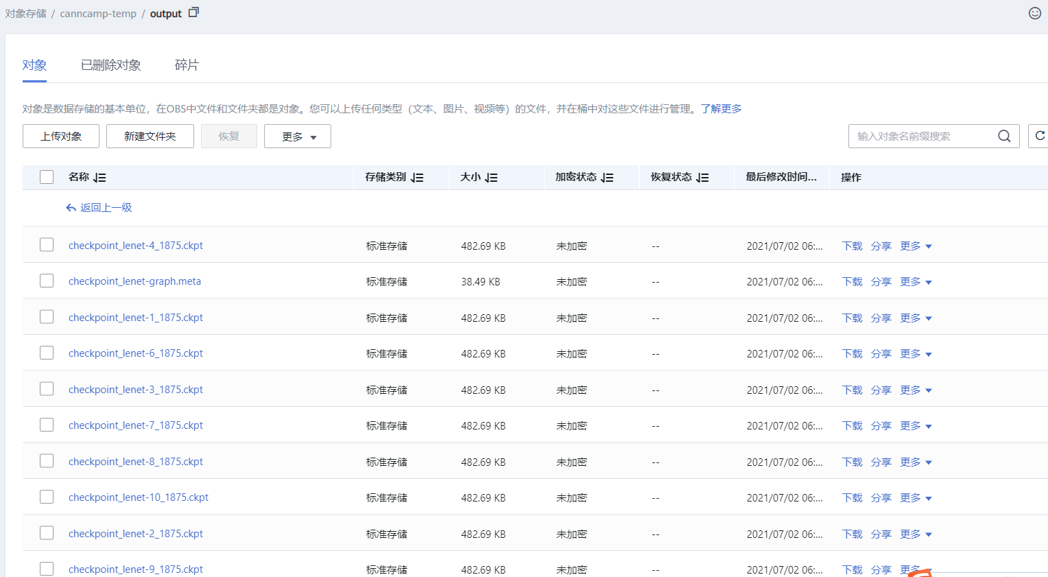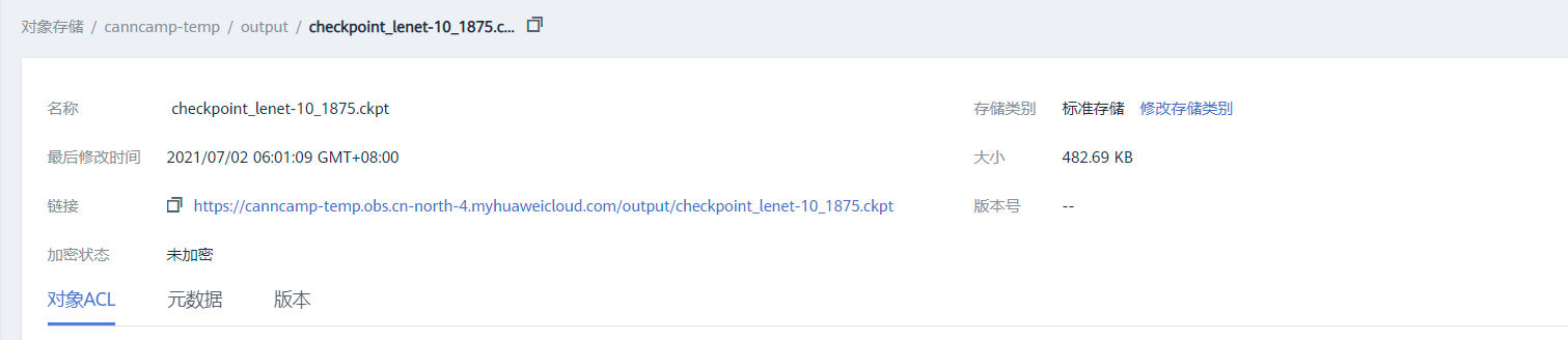 进入到OBS主页,然后点击页面中桶名字,然后进入选择【对象】,然后进入到我们存放输出文件的output文件,如果看到有一些ckpt文件产生,那就说明训练正常完成了。随后我们找到checkpoint_lenet-10_1875.ckpt这个文件,然后点进去