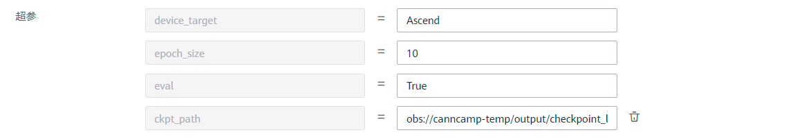 随后点击文件名右面的小图标,完成复制文件路径的操作后再回到创建训练作业的位置,和前面一样操作创建训练作业。唯一不同的是超参的位置我们需要把eval设置为True,然后在ckpt_path将我们前面复制的ckpt路径粘贴过来。