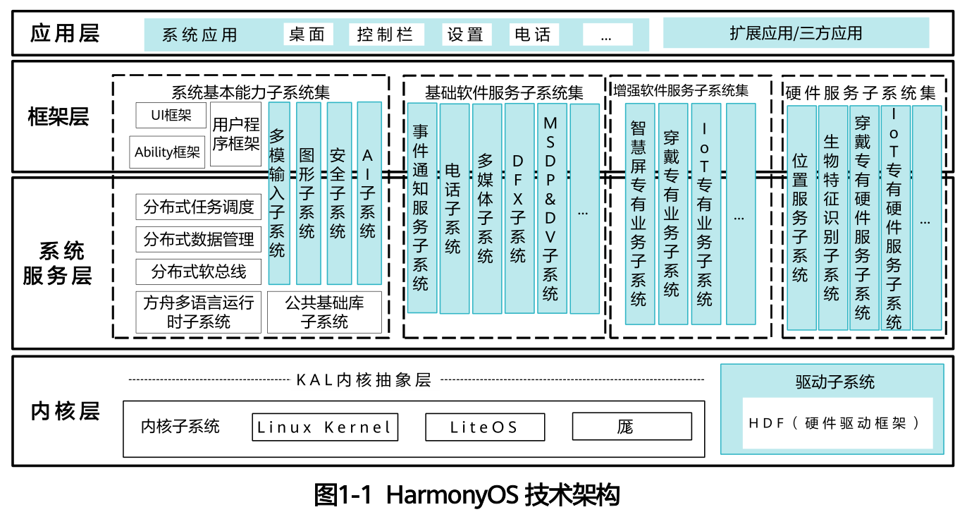 框架层为 HarmonyOS 应用开发提供了 Java/C/C++/JS 等多语言的用户程序框架和 Ability框架,两种 UI 框架(包括适用于 Java 语言的 Java UI 框架、适用于 JS 语言的 JS UI 框架),以及各种软硬件服务对外开放的多语言框架 API。