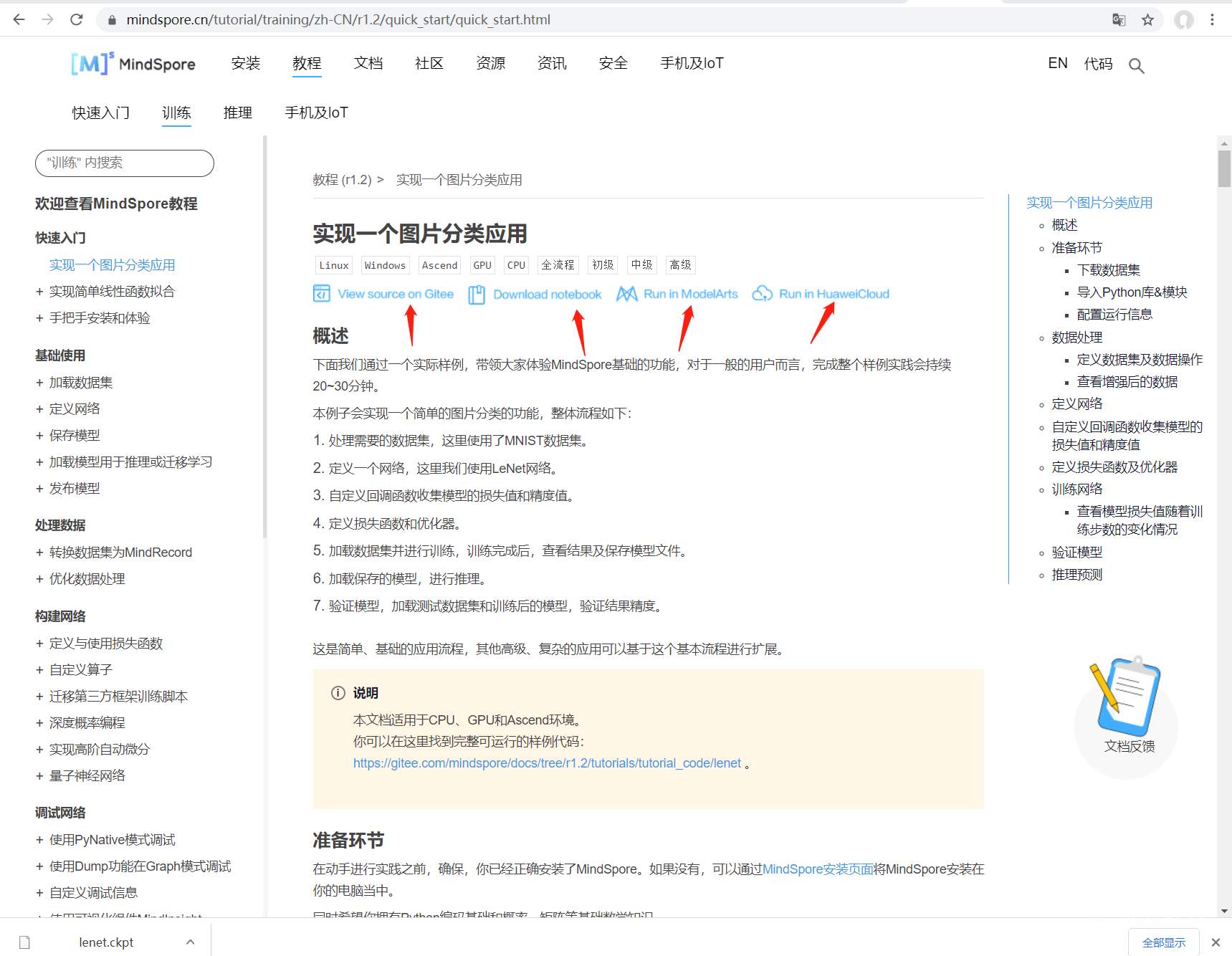 点开黄色部分的 https://gitee.com/mindspore/docs/tree/r1.2/tutorials/tutorial_code/lenet 这个链接: