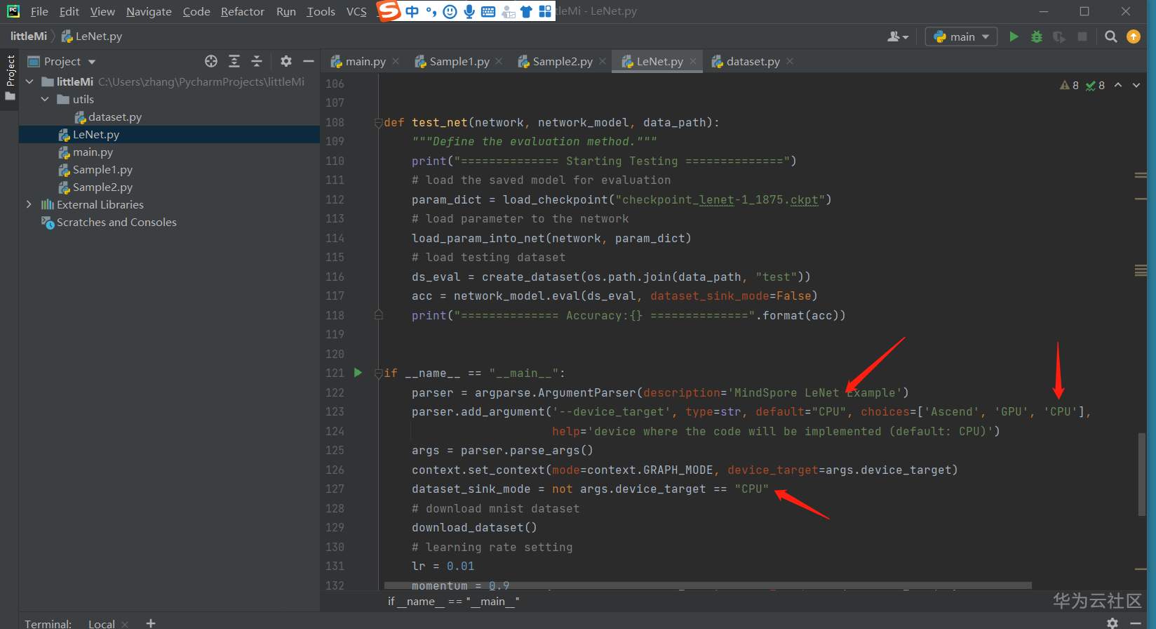 将LeNet.py的device改成Ascend(搜索代码中多处CPU,替换为Ascend)