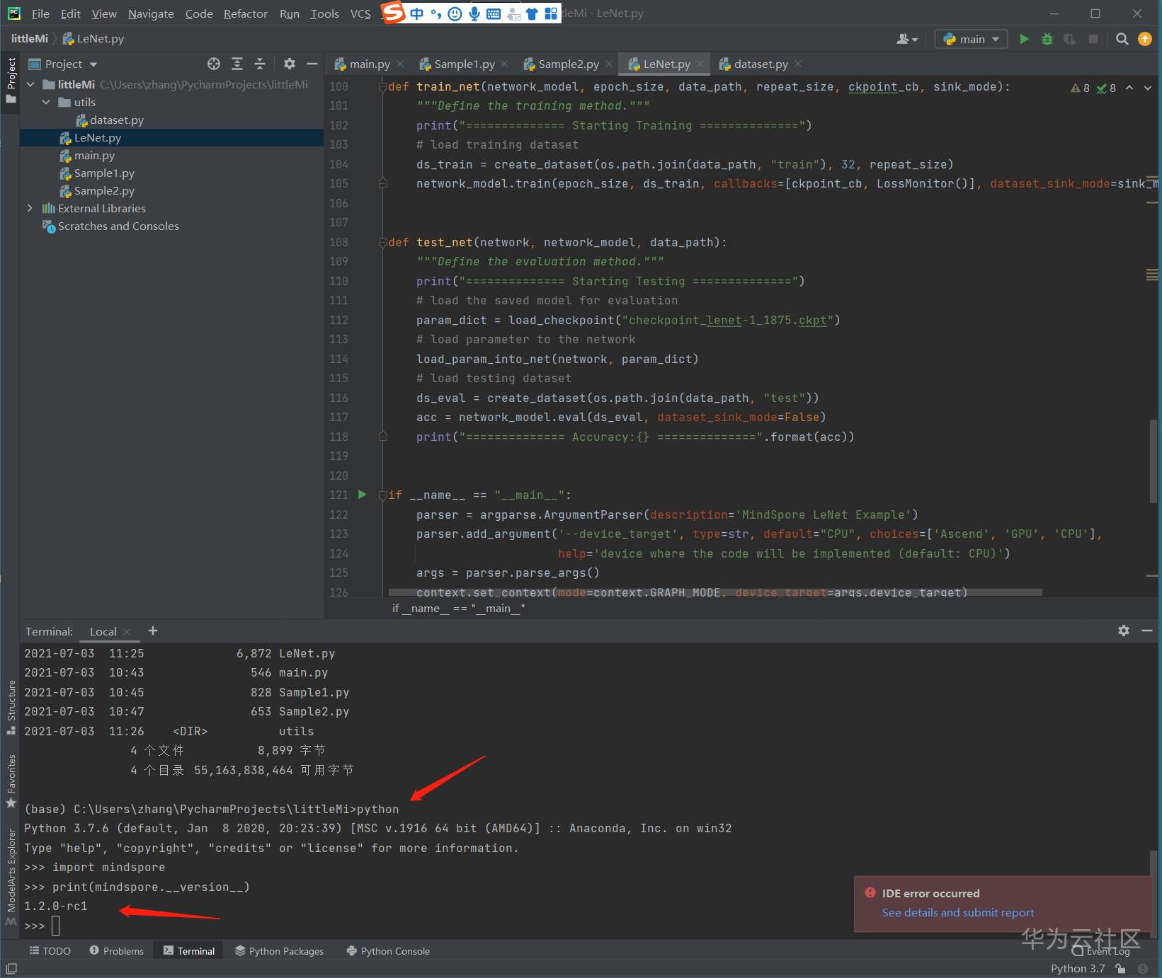 一、准备PyCharm ModelArts插件和MindSpore本地环境,并准备MindSpore的LeNet源代码