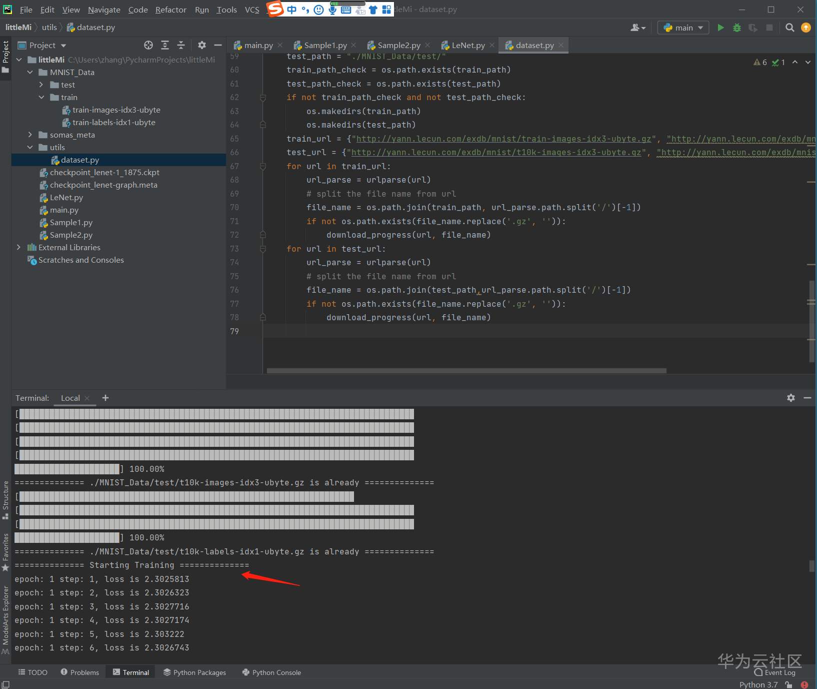 由于 PyCharm上传代码后,会自动建立 data_url, train_url这两个变量,所以 LeNet代码中需要对这两个代码做一些处理: