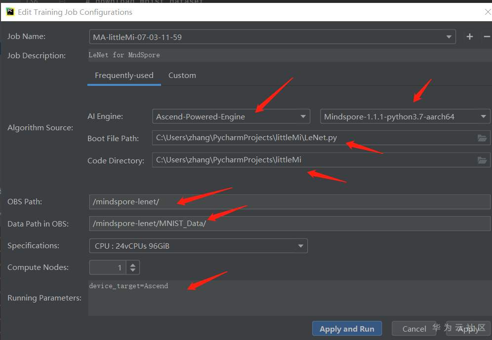 Running Parameters:填写 device_target=Ascend