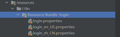1.1.3 添加需要切换的国际化配置文件,例如添加:中文配置文件 login_zh_CN.properties,英文配置文件 login_en_US.properties,此时IDEA会自动合并为一个国际化文件夹Resource Bundle ‘login’