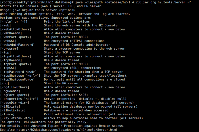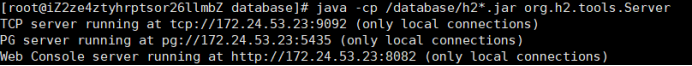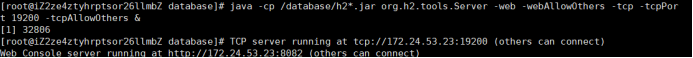 java -cp /database/h2*.jar org.h2.tools.Server -web -webAllowOthers -tcp -tcpPort 19200 -tcpAllowOthers &