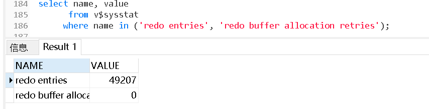 where name in ('redo entries', 'redo buffer allocation retries');