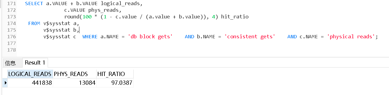 v$sysstat c  WHERE a.NAME = 'db block gets'    AND b.NAME = 'consistent gets'    AND c.NAME = 'physical reads';
