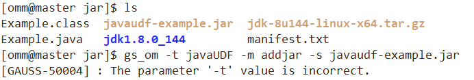 在gauss数据库里面,使用gs_om进行jar包的导入时,提示-t的选项有错误