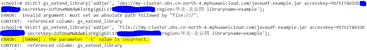 我使用obs上传了文件之后,再通过 gs_extend_library()函数来导入 jar 包,居然也报了一模一样的错误。