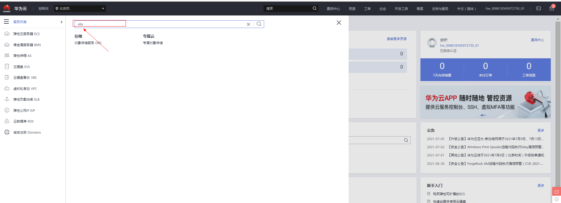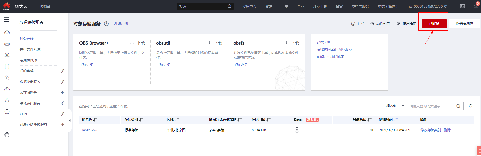 obs创建地址:https://console.huaweicloud.cn/console/?region=cn-north-4#/obs/manager/buckets