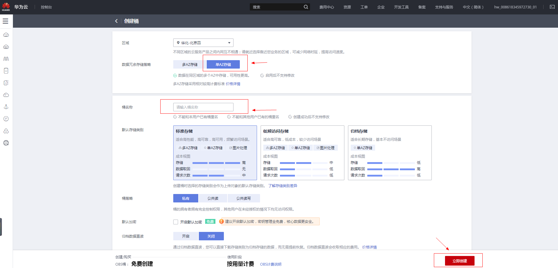 点击页面右上方的创建桶,随后在出来的页面中【数据冗余存储策略】选择【单AZ存储】