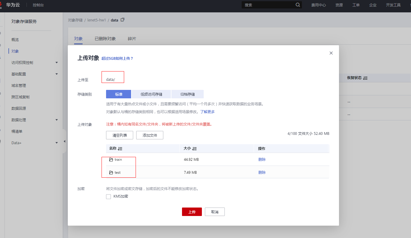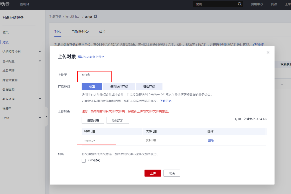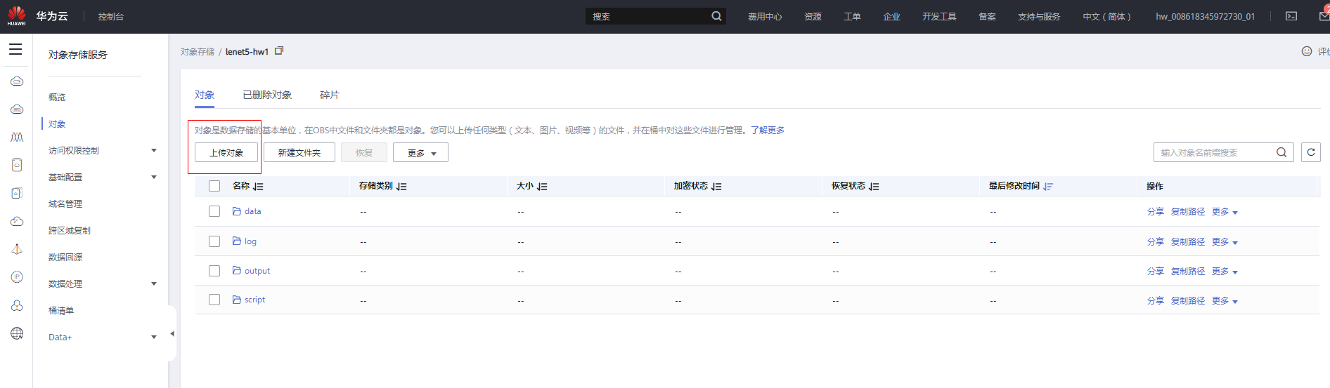 点击新建的OBS桶名,再打开【对象】标签页,通过【上传对象】等功能,将脚本和数据集上传到OBS桶中