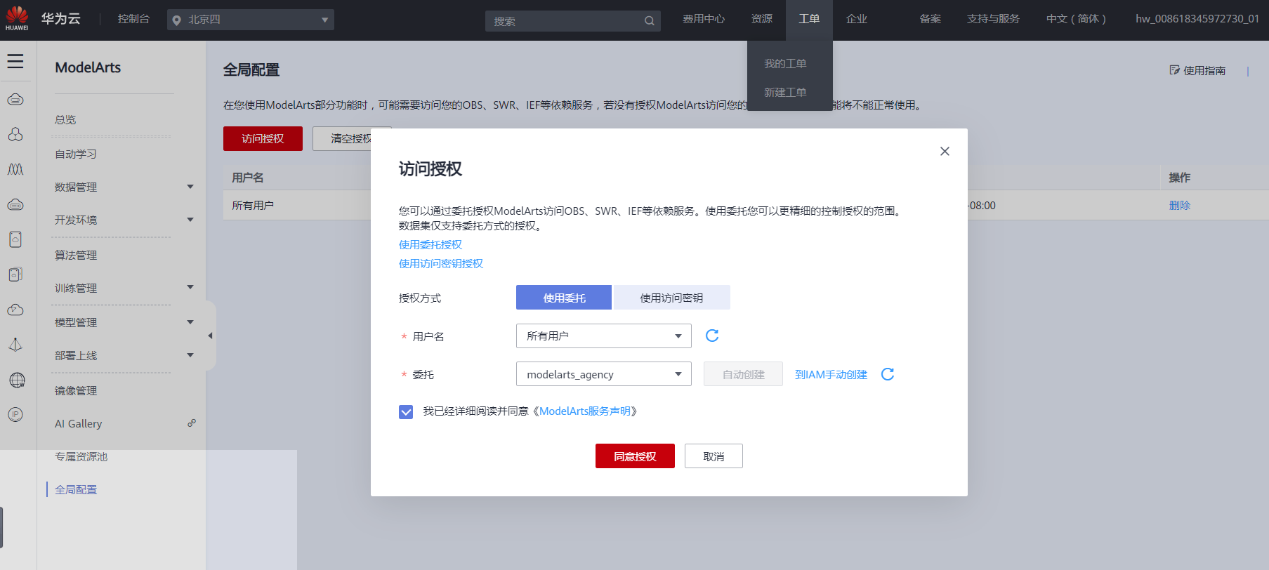 点击页面左面的【全局管理】-【访问授权】即可进入到访问授权页面了,然后我们选择用户,委托点击自动创建,然后点击同意授权完成授权。