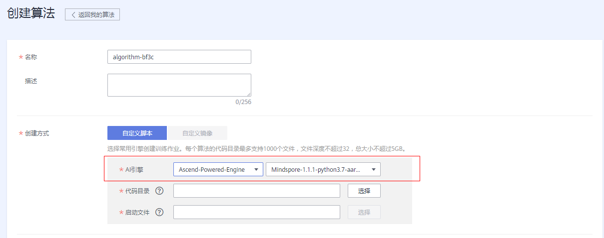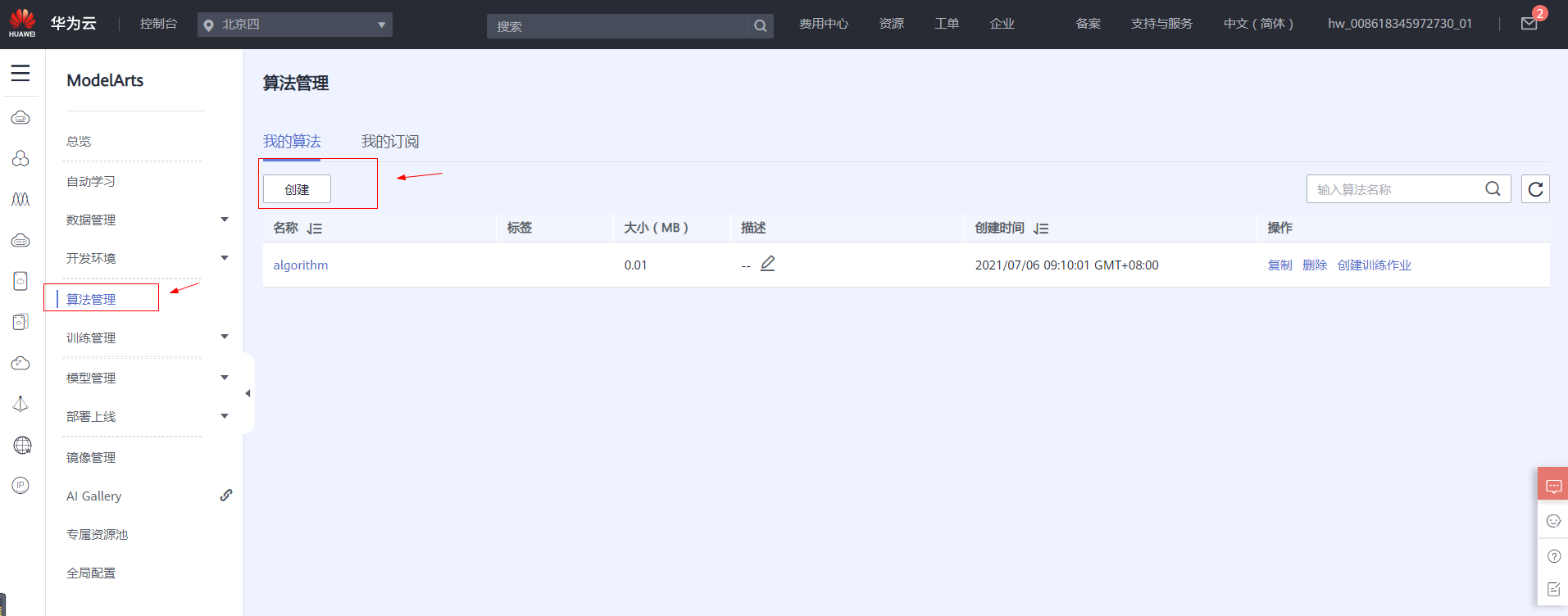 点击页面左面的【算法管理】-【我的算法】即可进入到算法管理页面了,然后我们点击页面上方的【创建】,开始创建我们的算法