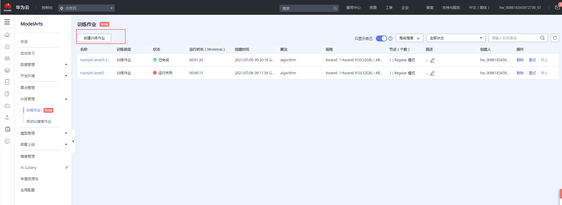 点击页面左面的【训练管理】-【训练作业New】即可进入到创建训练作业的页面了,然后我们点击页面上方的【创建训练作业】,开始创建我们的训练作业
