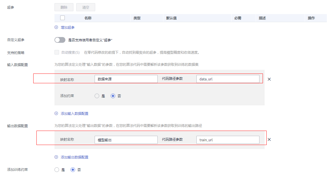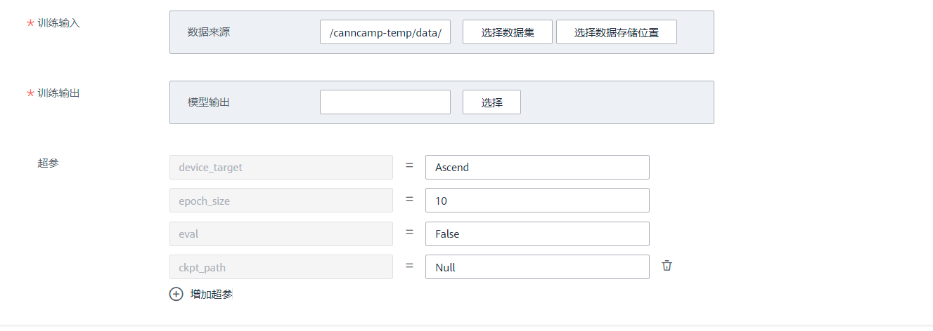 选择完算法后,接下再选择一下数据集,在页面【训练输入】的位置选择【选择数据存储位置】,然后找到我们前面创建的OBS桶点进去后找到我们前面存放数据集的目录【data】,点击data,进去后直接点【确定】即可(能看到train文件夹和test文件夹的时候点确定)