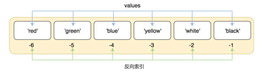 索引也可以从尾部开始,最后一个元素的索引为 -1,往前一位为 -2,以此类推。