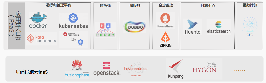 - 上层应用方案:基于HaProxy、Dubbo、ElasticSerch等建立负载均衡、微服务、全息监控、日志中心等周边配套云生态。