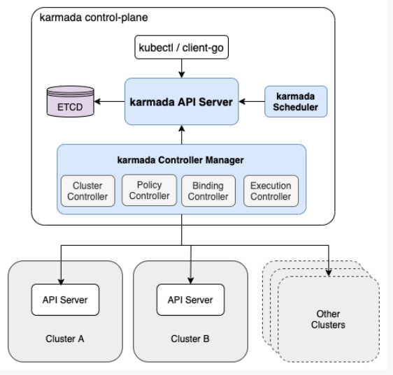 1)Karmada以类k8s的形式部署,它有API Server、Controller Manager等,对我们已经拥有存量那么多k8s集群的企业来说,改造成本是比较小的,我们只需在上面部署一个管理集群即可