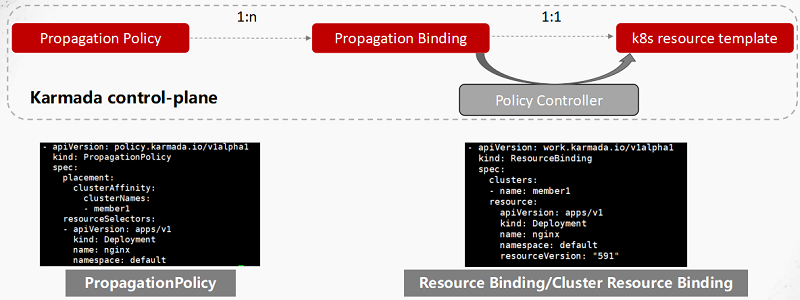 当定义完Propagation Policy之后,之前定义的想要下发的K8s resource template会自动跟它进行匹配,匹配之后,deployment会被分发到比如说ABC三个集群,这样就跟ABC三个集群产生了绑定,这个绑定关系就是Resource Bindding。