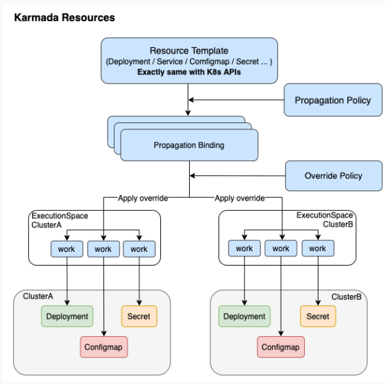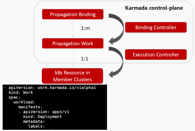当我们定义了deployment之后,它通过 Propagation Policy进行匹配,然后它就会产生一个绑定关系,就是Propagation Binding,然后再通过一个 override的一个policy,就产生了每一个works。这个works其实就是在子集群中各个资源对象的一个封装。在这里我觉得比较重要的是propagation以及workers机制。