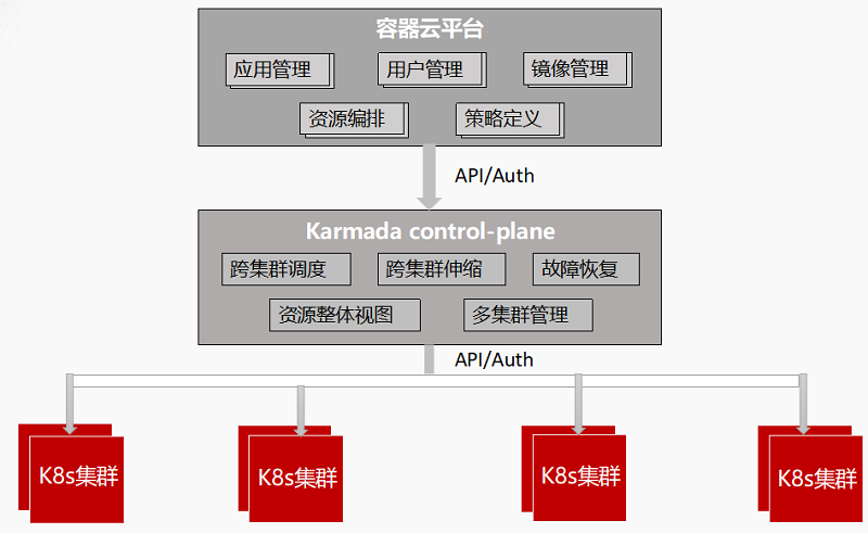 在这方面我们希望之前提到的多集群管理、跨集群调度、跨集群伸缩、故障恢复以及资源整体视图方面都全部下沉到Karmada这样一个控制平面。