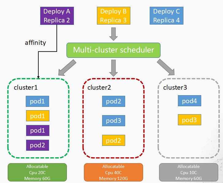 整体的调度设计完之后,我们希望在工行产生的效果如下图,当我调度 deployment A时,它是因为偏好的设置调度到cluster 1; deployment B因为一个故障域打散,它可能调度到了cluster 123三个集群;deployment C也是一个故障域打散,但是因为资源余量的原因,它多余的pod被调度到了cluster 2这样一个集群。