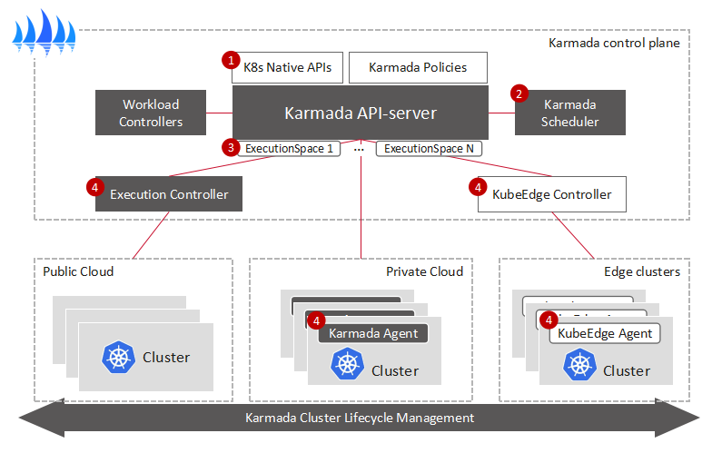 Karmada是基于 Kubernetes Federation v1 和 v2 开发,它可以跨多个 Kubernetes 集群和云运行云原生应用程序,而无需对应用程序进行更改。通过直接使用 Kubernetes 原生 API 并提供高级调度功能,Karmada 可以实现真正的开放式多云 Kubernetes。
