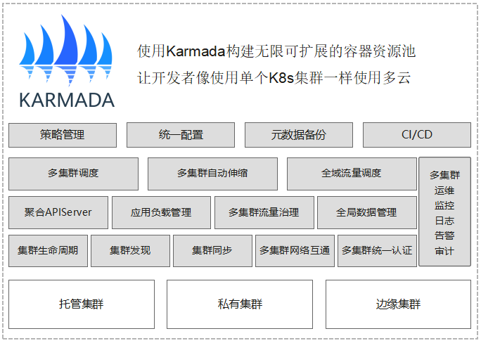 上图为我们认为应该在开源社区所要呈现的多云多集群的技术站视角,图中灰色框也是Karmada要覆盖的所有的能力范围。从数据面、存储以及运维相关的维度来看,我们向上要去解决容器网络的多云多集群,服务发现的多云多集群甚至流量治理,原数据的持久化,这些将会Karmada项目在社区里所要涵盖的范围。