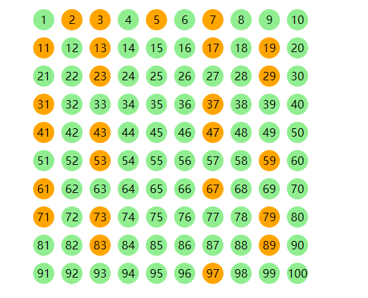 以上样例是从100个数字中挑选出素数,把素数的背景设置为橙色。这里的选择器共有5行。前4行分别把数字2、3、5、7标明为素数。第5行很长,我们拆开看,它的第1部分是.prime-numbers div,意思是所有<div>元素都被选中(被当作素数),后面跟随了5个:not()选择器,用于排除掉不是素数的数::not(:nth-child(1))排除掉了第1个数,因为数字1不是素数,接下来:not(:nth-child(2n))排除掉了所有能被数字2整除的数,再接下来的:not(:nth-child(3n))、:not(:nth-child(5n))、:not(:nth-child(7n))排除掉了所有能被数字3、5、7整数的数,以上这些选择器都是连缀着一路写下来的,最后的::before表示设置选择的是以上剩余的元素的伪元素。
