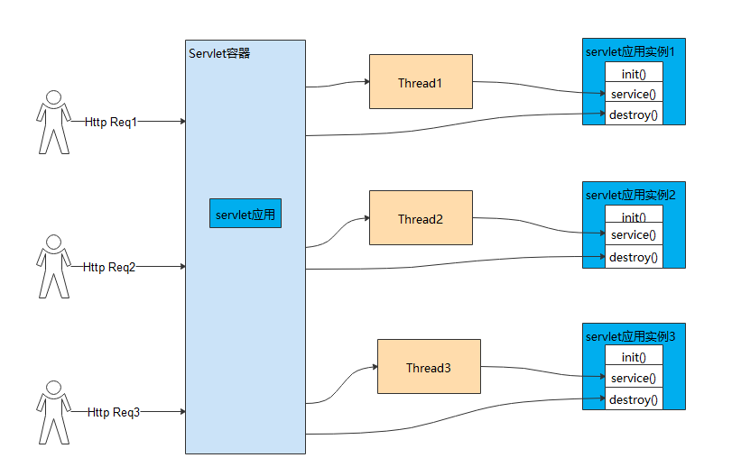 注意:servlet实例的生命周期是由Servlet容器控制,并不是完成一次请求处理的线程来控制的;init()方法在servlet实例创建的时候只完成一次,当处理HTTP请求的线程完成任务时,只是service()方法执行完了,destroy()方法并不会执行,由Servlet容器控制。