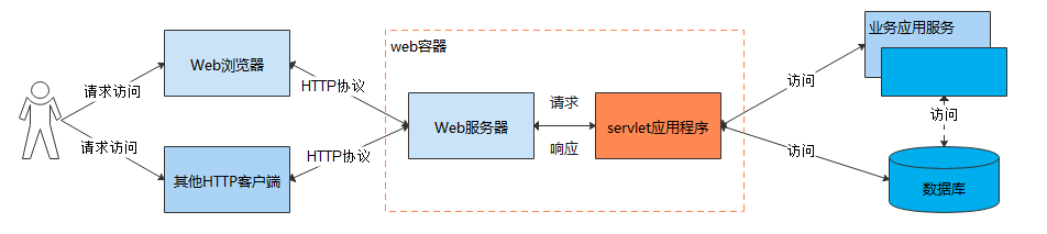 servlet就是一个java应用程序,实现了servletAPI规范的java应用程序就是一个servlet,主要是用来处理来自web浏览器或者其他HTTP客户端的请求,常常跟我们的业务程序或者我们的数据对接,相当于一个中间层的作用,动态地生成内容给服务器;要部署和运行servlet,需要使用web容器(servlet容器),web容器本质上就是与servlet交互的web服务器组件,web容器负责管理servlet的生命周期,将URL映射到特定的servlet(具体在web.xml中配置)并确保URL请求者具有正确的权限。如下图: