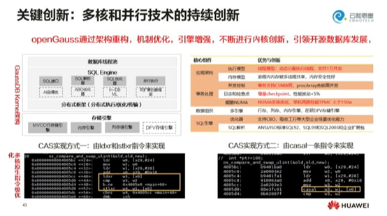 面对这样的场景,openGauss做出了一些变化,它不断通过架构的重构,机制的优化,内核上的创新和引擎上的增强,来解决多核处理下的性能问题。openGauss有不少特性,例如它支持CSN快照,增量checkpoint,NUMA多核优化等,通过这些优化,使得中国数据库第一次具备了数据库和处理器之间的联合调优。这在以前是不可能的,但有了鲲鹏的处理器,才能做出这样的改变。比如,我们在CPU 元子级的处理上,比如CAS的指令级,在数据库的处理上会看到标准的处理步骤的4个指令完成,但通过指令级的优化,在鲲鹏处理器中,就优化成了1个,这样就提高了10%的性能。