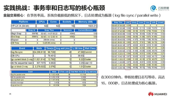 这是一个Oracle的案例中的示范,是一个金融级客户的核心。从以下数据中我们不难发现,它最显著的是等待log filesync,即日志同步。它的等待时间达到了16000秒,而数据库总时长为18000秒,load的时长还不到1。而且就单核来看,它的日志写也已经达到了100%。这使得日志处理成为了核心瓶颈。