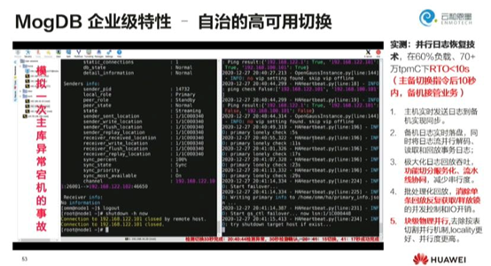 目前在所有的商业案例中,用户最看重的是当数据库出现问题的时候,如何实现自治的高可用切换。基于此需求,云和恩墨开发了Gauss-GSHA高可用切换组件。它所做的就是判断各种异常的场景,当数据库发生异常时,在备库里重新进行选择和自动切换,而在主备切换指令后10秒内,备机就可以接管业务。