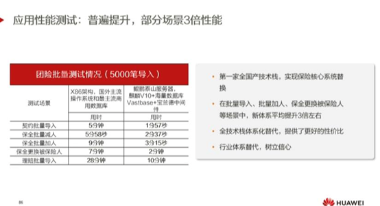 客户以前用的是Dell服务器和oracle数据库,采用国产全栈新体系后,我们可以发现,在批量导入、批量加入、保全更换被保险人等场景中,新体系的性能平均提升了3倍左右。另外还涉及到了全栈性价比的问题,这为行业在体系替代方面树立了很好的信心。