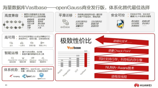 商业发行版的优势在于它的高度兼容性,平滑迁移、安全可控性,高可用性、智能运维,以及由进程改线程、NUMA-Aware技术、同时支持行存、列存和内存引擎、增量checkpoint等技术融合体现出的极致性价比。此外,由鲲鹏CPU、openeular、openGauss完善、领先的一栈式体系优势也将是促成极致性价比的选择。