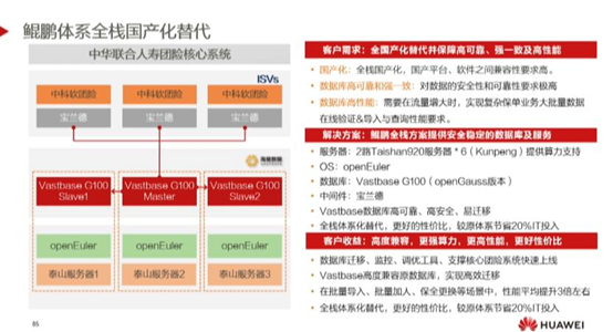中华联合人寿团险的核心系统是第一家实现全栈替代的。由泰山服务器、openeuler、vastbase宝兰德以及中科软操作系统组成。解决了客户对于国产平台与软件之间的兼容性、数据安全性和可靠性,以及在需求流量增大时,能实现复杂保单业务大批量数据在线验证&导入与查询性的高要求。这种全栈体系化最终能为客户带来高度兼容、更强算力、更高性能、更好性价比的客户体验,例如在预算方面较原体系就能节省20%IT投入。