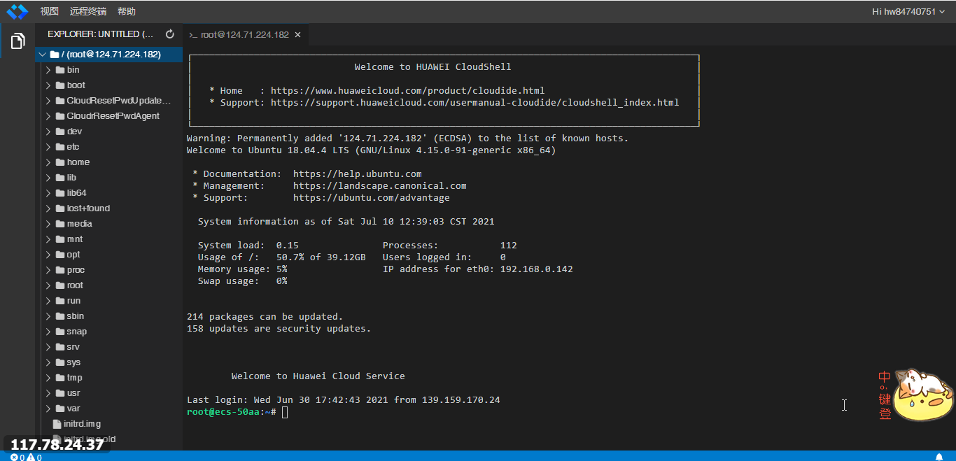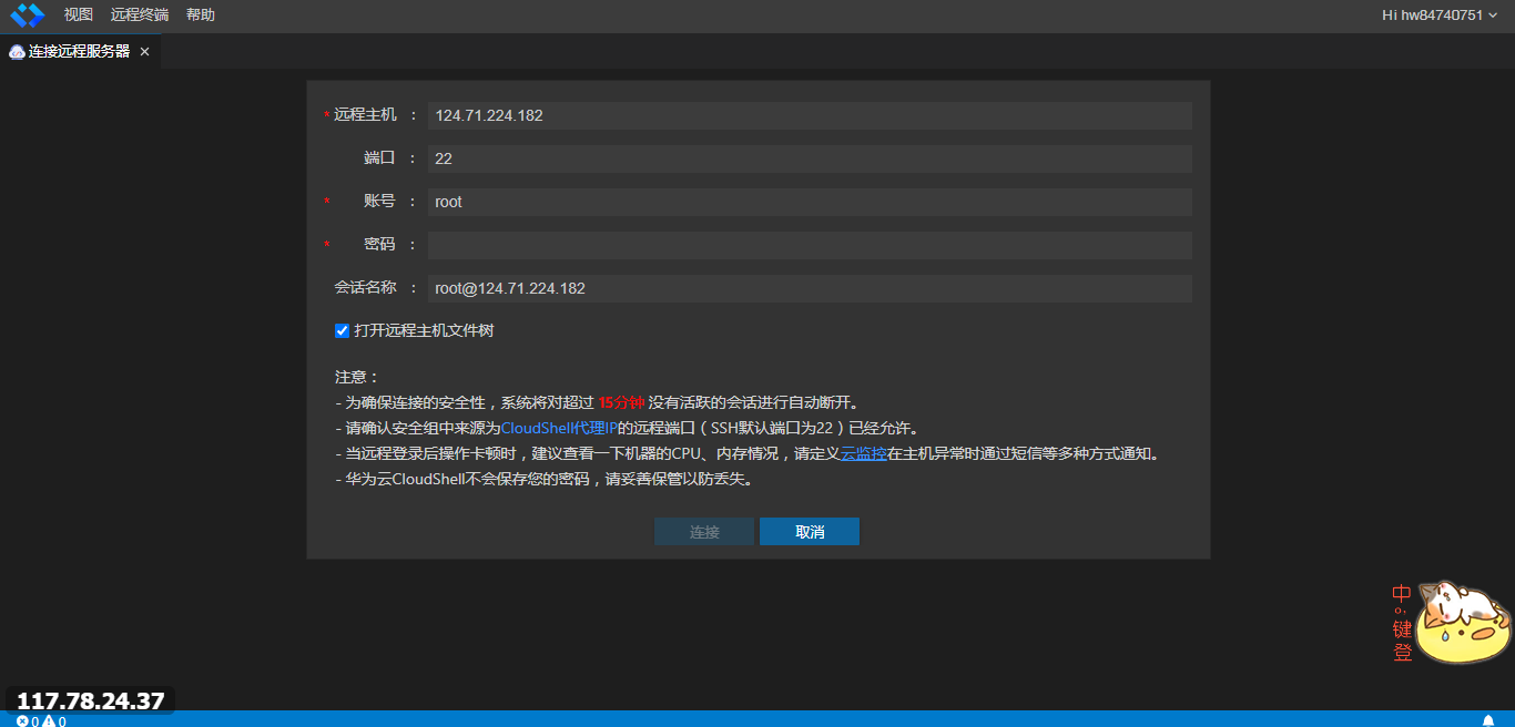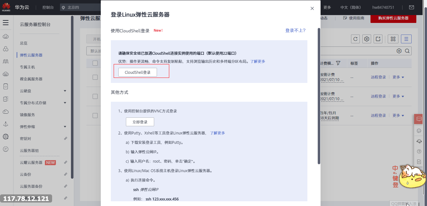 点击远程登录 这里我们用华为云自带的cloudshell进行操作