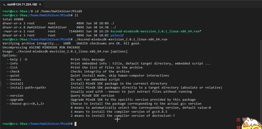 创建MindX SDK开发套件包的安装路径 这里不指定安装路径,直接安装到MindX SDK开发套件包所在的路径即可