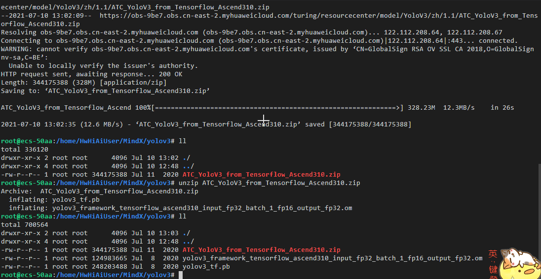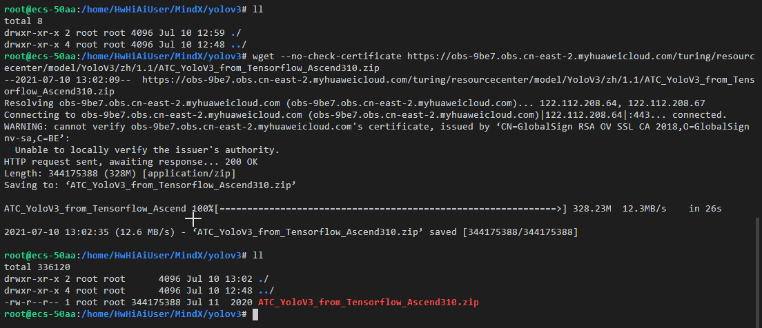 wget --no-check-certificate https://obs-9be7.obs.cn-east-2.myhuaweicloud.com/turing/resourcecenter/model/YoloV3/zh/1.1/ATC_YoloV3_from_Tensorflow_Ascend310.zip