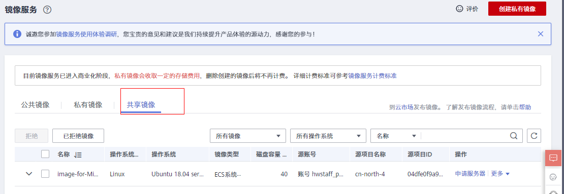 这里的镜像找小助手申请后需要自己在镜像服务里面选择接受才可以, 接收之后这里创建弹性云服务器时才能够找到学习用的镜像