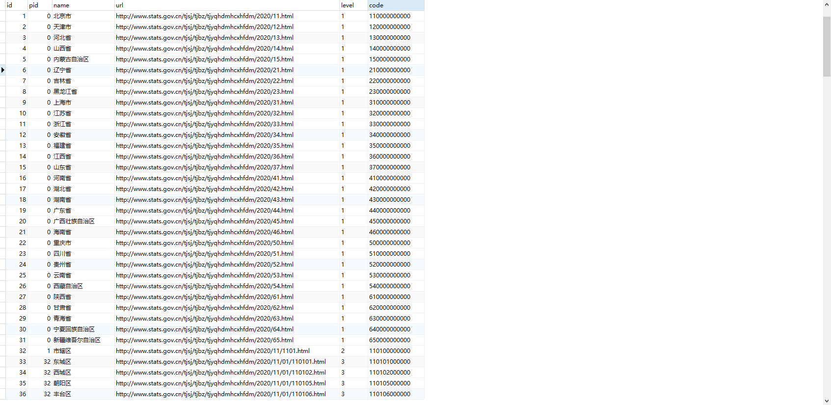 本爬虫主要爬取国家统计局省市区数据,数据存储采用Mysql,首先在Mysql数据库中创建存储省市区数据的表,脚本如下: