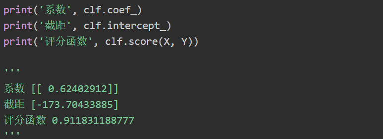 同时调用代码预测2017年企业成本为1200元的利润为575.1元。注意,线性模型的回归系数会保存在coef_变量中,截距保存在intercept_变量中。clf.score(X, Y) 是一个评分函数,返回一个小于1的得分。评分过程的代码如下: