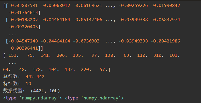 调用load_diabetes()函数载入糖尿病数据集,然后输出其数据data和类标target。输出总行数442行,特征数共10个,类型为(442L, 10L)。其输出如下所示: