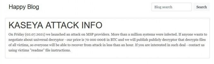 7月2日勒索组织REvil,攻击了一家来自瑞典的IT管理服务提供商(managed service providers(MSP)) – Kaseya。